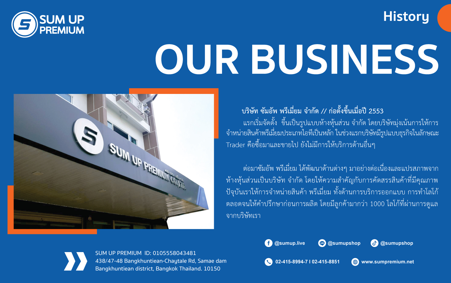 ที่ SUM UP PREMIUM เราเข้าใจว่า เวลา คือทรัพยากรอันมีค่า และเราพร้อมเป็นเบื้องหลังความสำเร็จของคุณ ด้วยสินค้าพรีเมี่ยมคุณภาพเยี่ยม พร้อมผลิตและจัดส่ง เพื่อให้คุณไม่ต้องรอนานอีกต่อไป